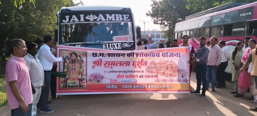 छत्तीसगढ़ शासन की महत्वाकांक्षी श्री रामलला दर्शन योजना (अयोध्या धाम) के अंतर्गत जिले से चयनित श्रद्धालुओं का दल आज कलेक्टर श्री रणबीर शर्मा के मार्गदर्शन में अयोध्या धाम के लिए रवाना हुआ। इस योजना के अंतर्गत शासन द्वारा 62 तीर्थयात्रियों (जिसमें 02 अनुरक्षक शामिल हैं) का लक्ष्य निर्धारित किया गया था। इस लक्ष्य के अनुसार जिले के जनपद पंचायत बेमेतरा, साजा, बेरला, नवागढ़ से 48 तीर्थयात्री तथा नगर पालिका परिषद् बेमेतरा एवं नगर पंचायत थानखम्हरिया, नवागढ़, भिमौरी, कुसमी एवं दाढ़ी से 12 तीर्थयात्री चयनित किए गए।